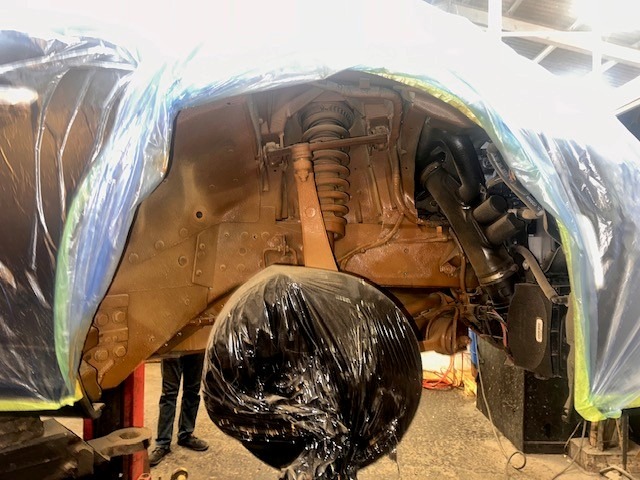 The vehicle bodywork is wrapped to protect against overspray. Wheel hubs and braking components are carefully masked to ensure no product interferes with braking performance.